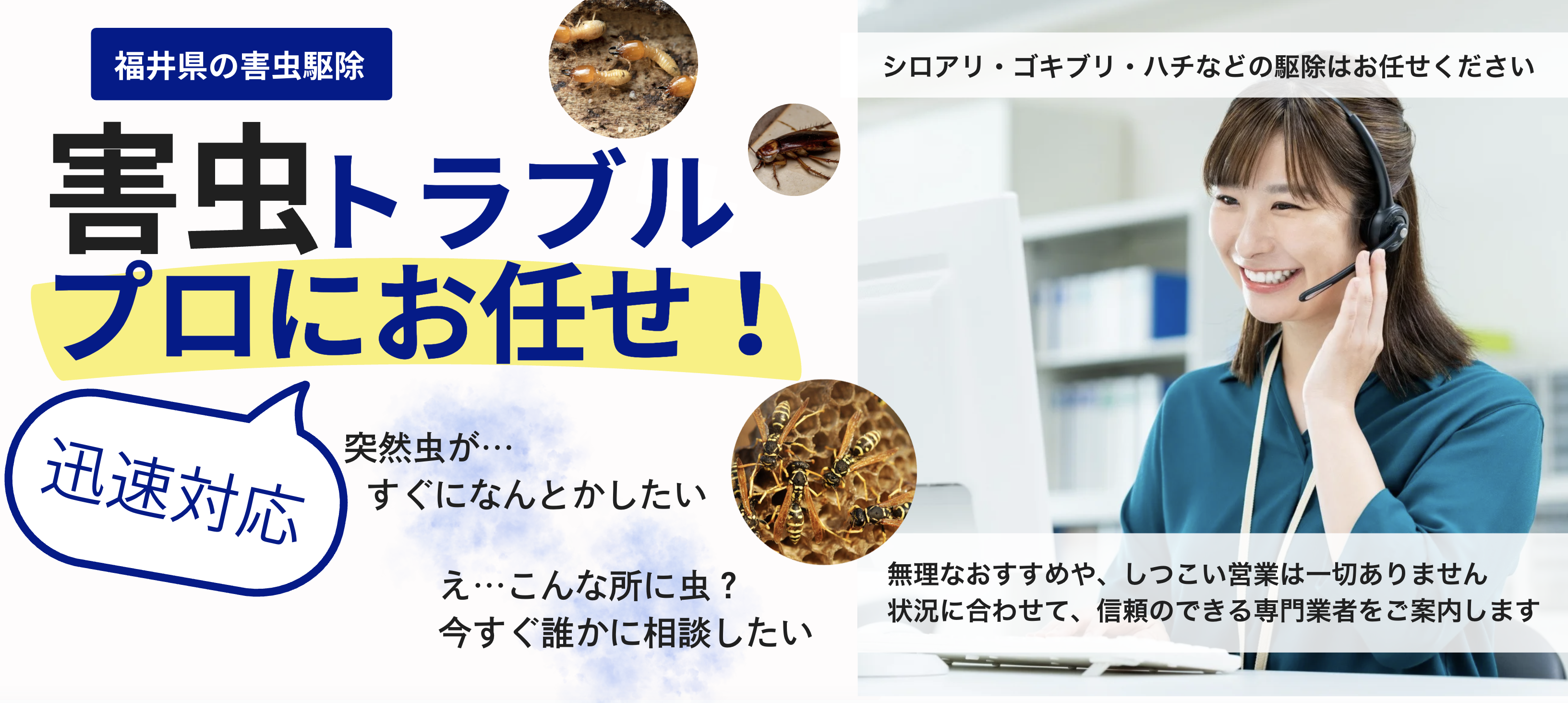 害虫駆除の相談窓口では、「福井県」の以下の地域を対象に、害虫駆除の相談を受け付けております。
